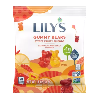No-sugar-added fruit-flavored gummy bears in strawberry, raspberry, orange, and lemon. Sweetened with allulose and stevia.