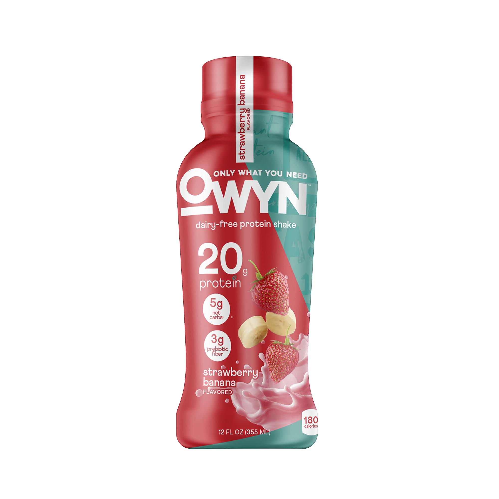 Plant-based strawberry banana shake with pea, organic pumpkin seed, and flax protein. 20g protein, 4g organic cane sugar, 5g net carbs per 12 fl oz bottle. Top-9 allergen friendly. Sweetened with organic cane sugar and monk fruit extract.