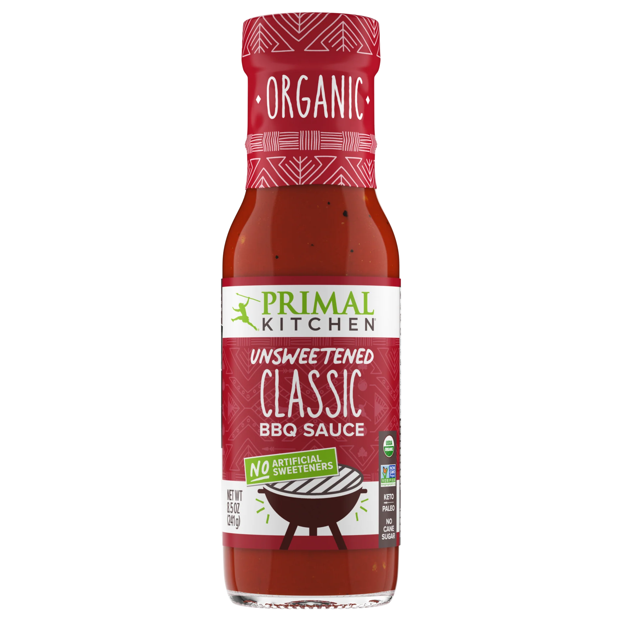 Organic unsweetened BBQ sauce sweetened with dates and figs (natural). 15 cal, 3g carbs, 2g sugar (0g added), 1g fiber per 2 tbsp. No cane sugar, corn syrup, agave, honey, or maple syrup.