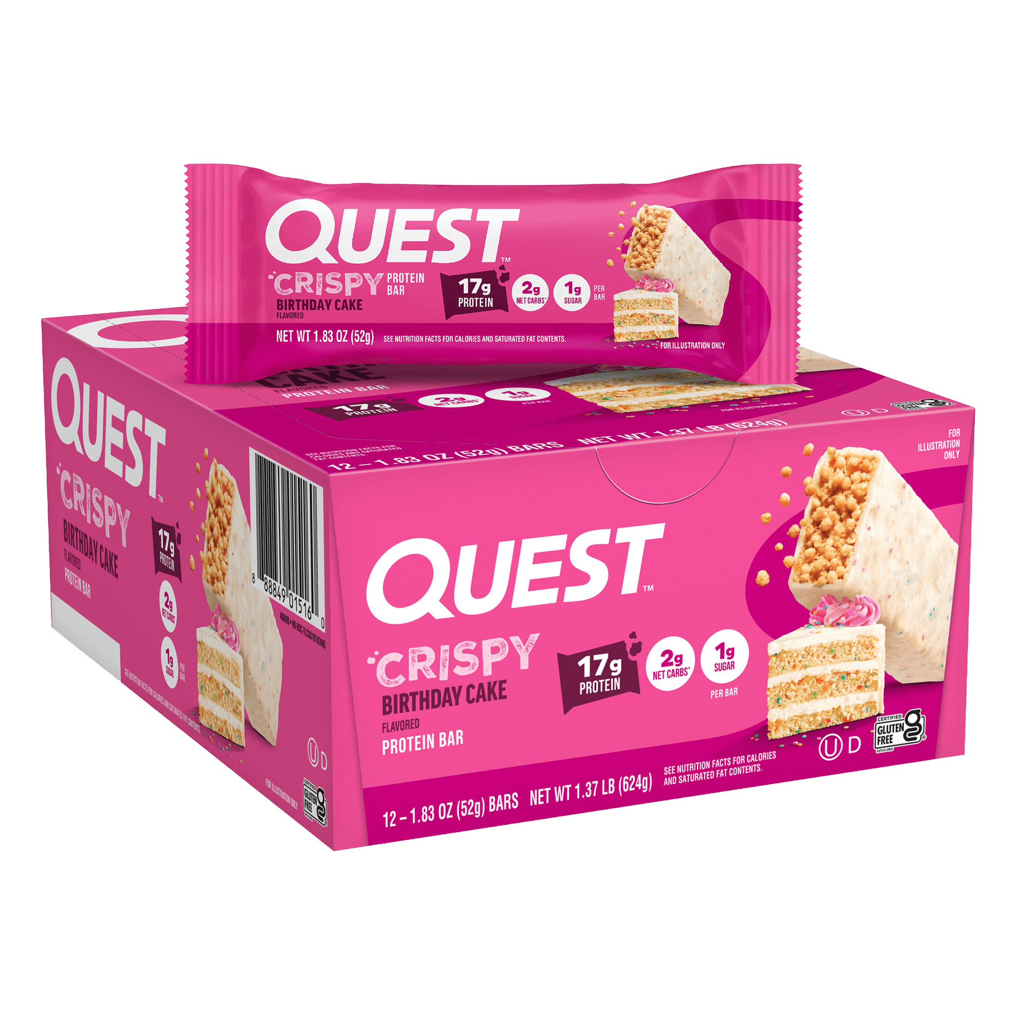 Crispy birthday cake-flavored Hero bar with sparkle-coated frosting and a chewy crisp center, delivering 17g protein, 1g sugar and 2g net carbs per bar.