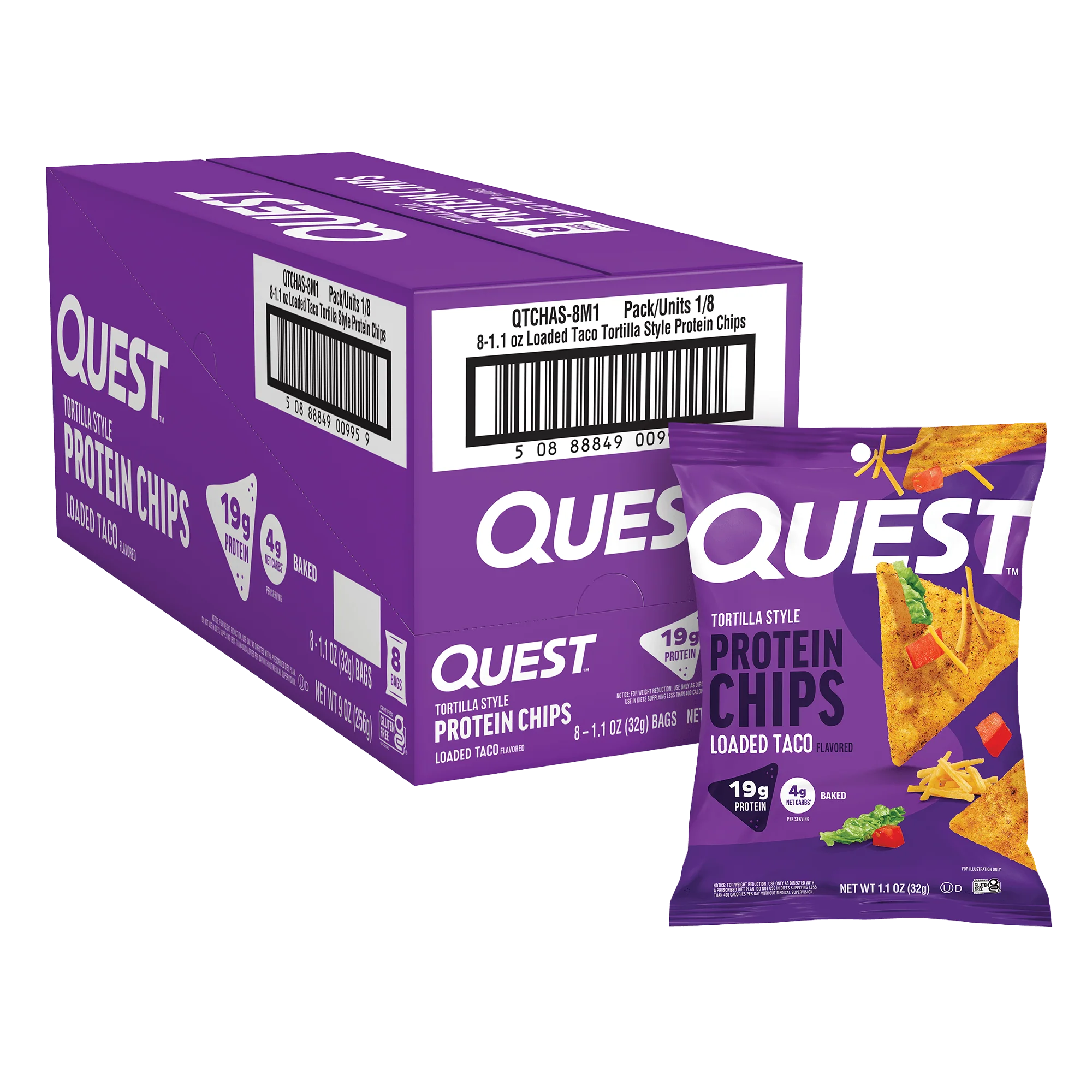 Loaded-taco tortilla-style protein chips with 19g protein per 32g bag, 4g net carbs. Sweetener blend with stevia.