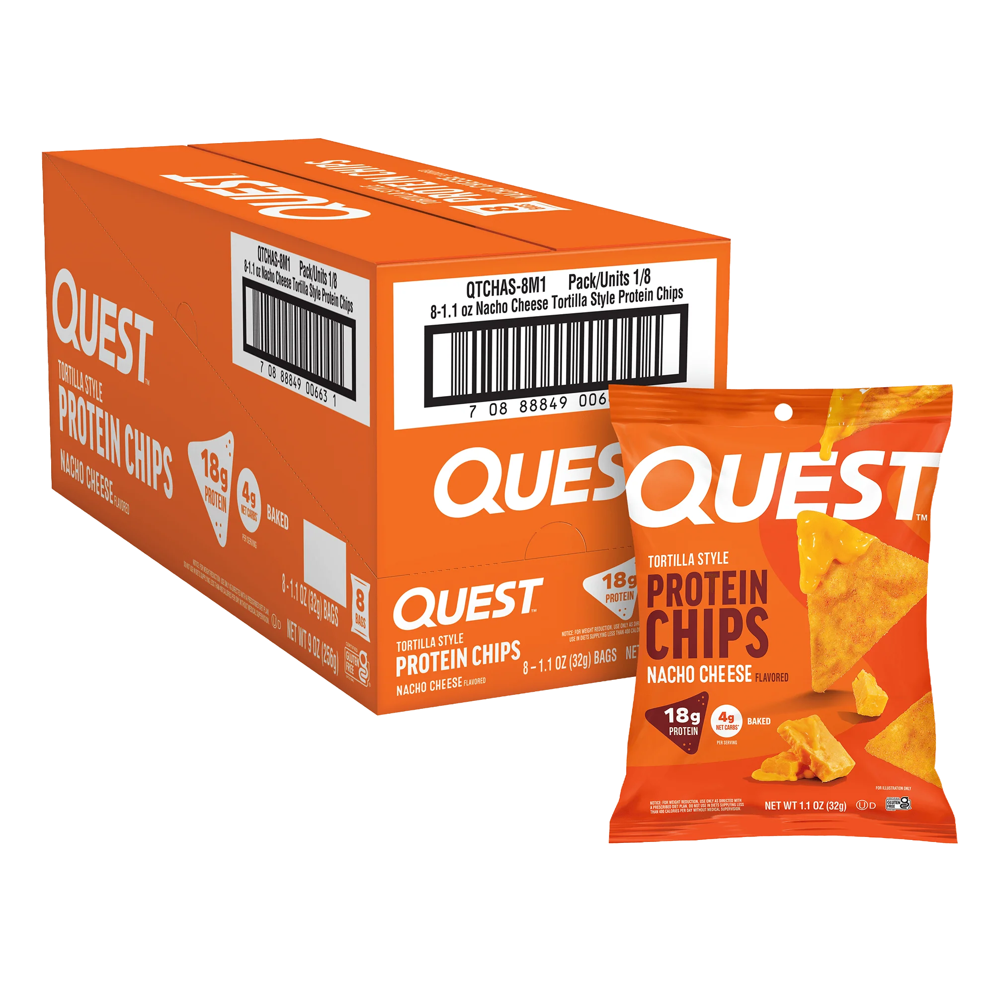 Baked tortilla-style protein chips with 18g protein per 32g bag. Made from milk protein isolate, sunflower/canola/soybean oil. Stevia used for a tiny bit of sweetness in the seasoning.