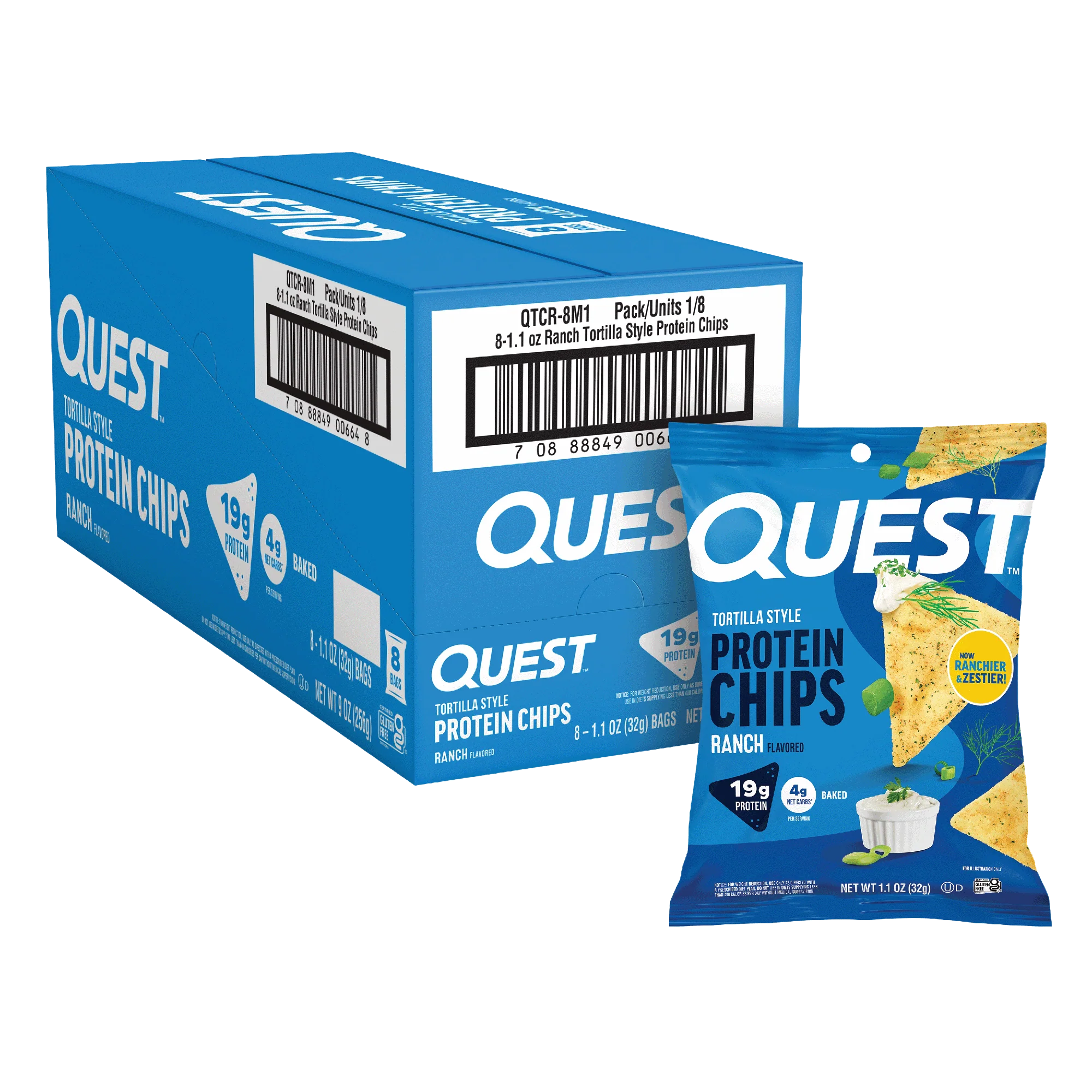 Ranch-flavored tortilla-style protein chips with 19g protein per 32g bag. Includes a small amount of sugar in seasoning plus stevia sweetener.