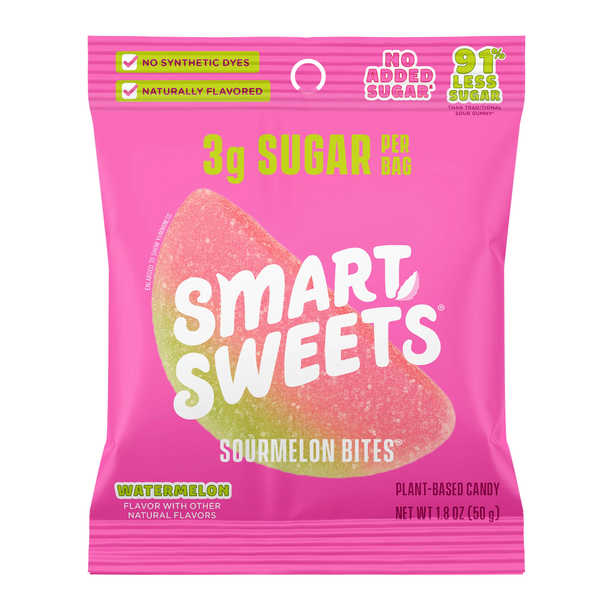 Sour watermelon low-sugar gummy bites. 130 calories, 3g sugar and 6g fiber per 50g bag, 91% less sugar than leading equivalents.