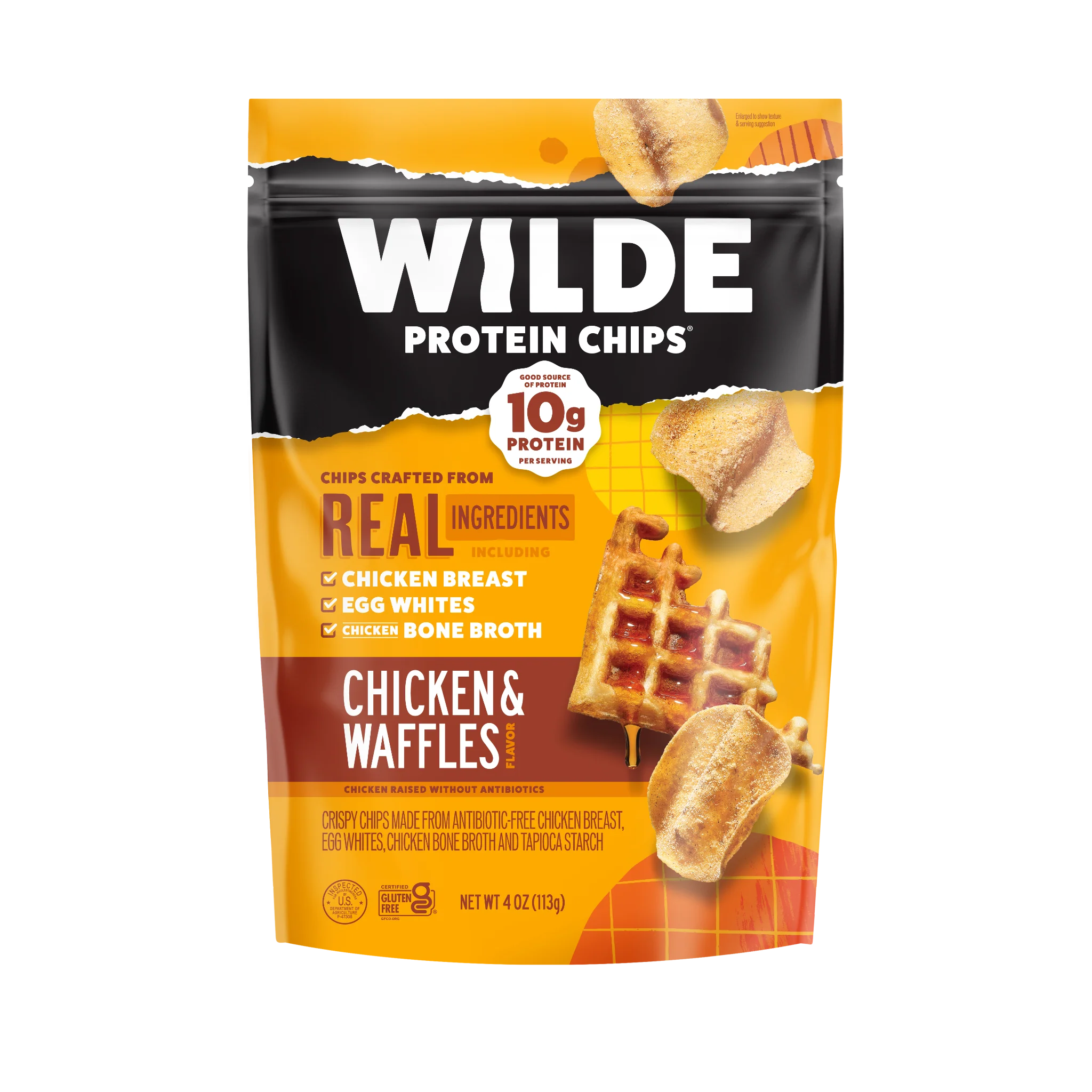 Thin, crispy protein chips made from chicken breast, egg whites, bone broth. Sweet-savory maple waffle flavor. 160 cal, 10g protein per 30g serving.