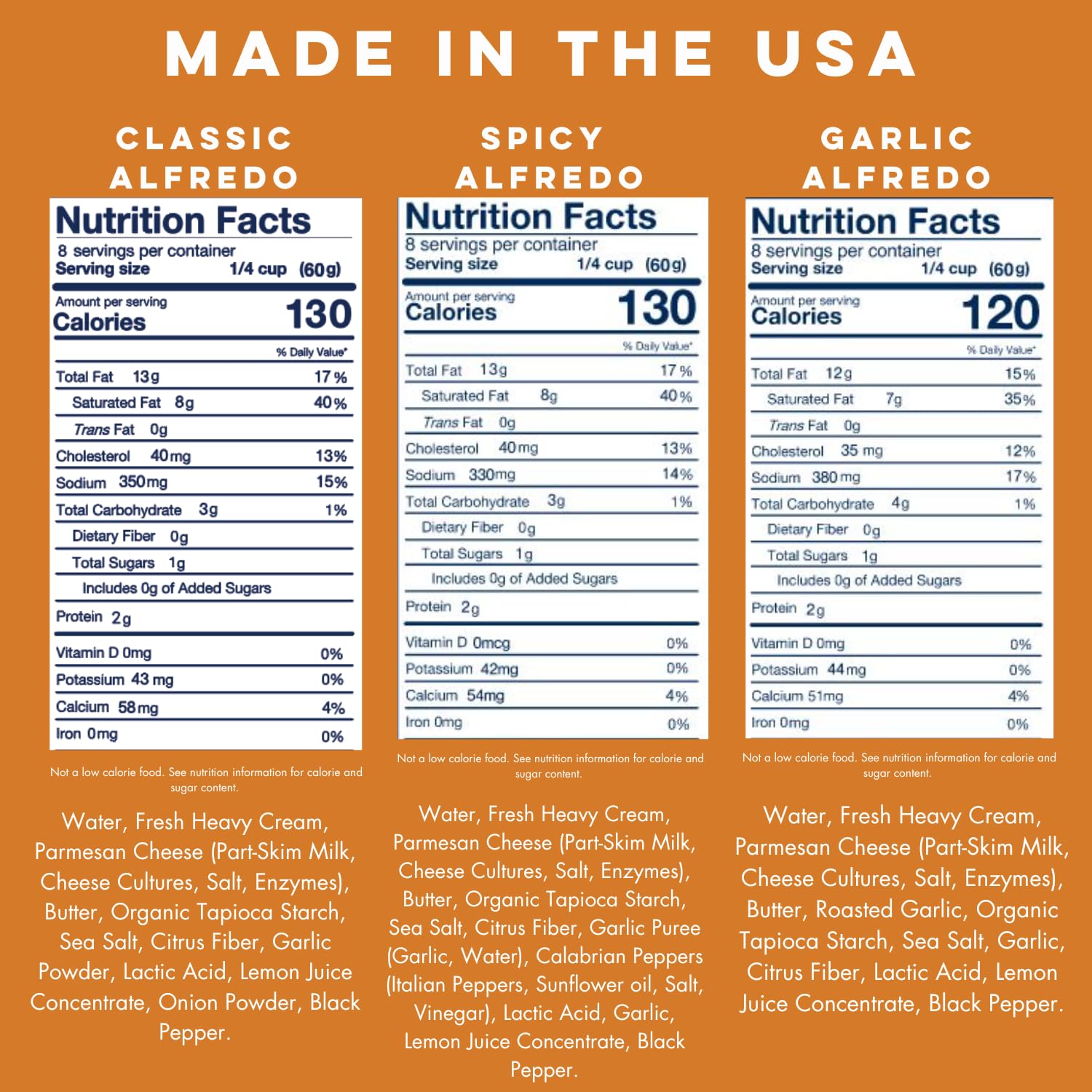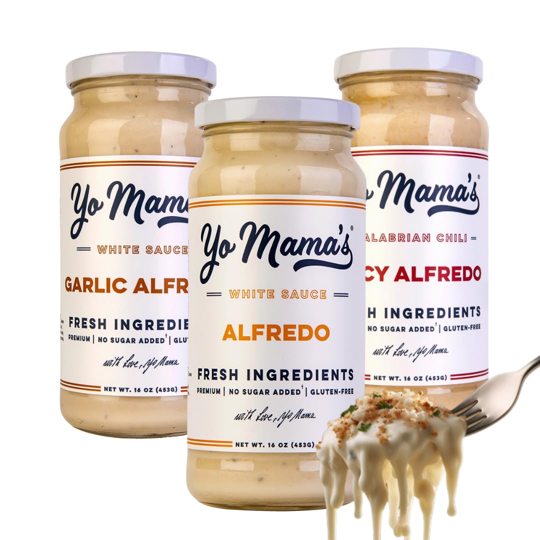 Yo Mama’s Foods Gourmet Keto Alfredo Pasta Sauces Variety Pack | (3) 16 Ounce Glass Bottles | Classic (1), Garlic (1) and Spicy (1) Alfredo Sauce is Low Carb, Paleo, Gluten Free, Low Calorie and is Made with only the Freshest Ingredients!
